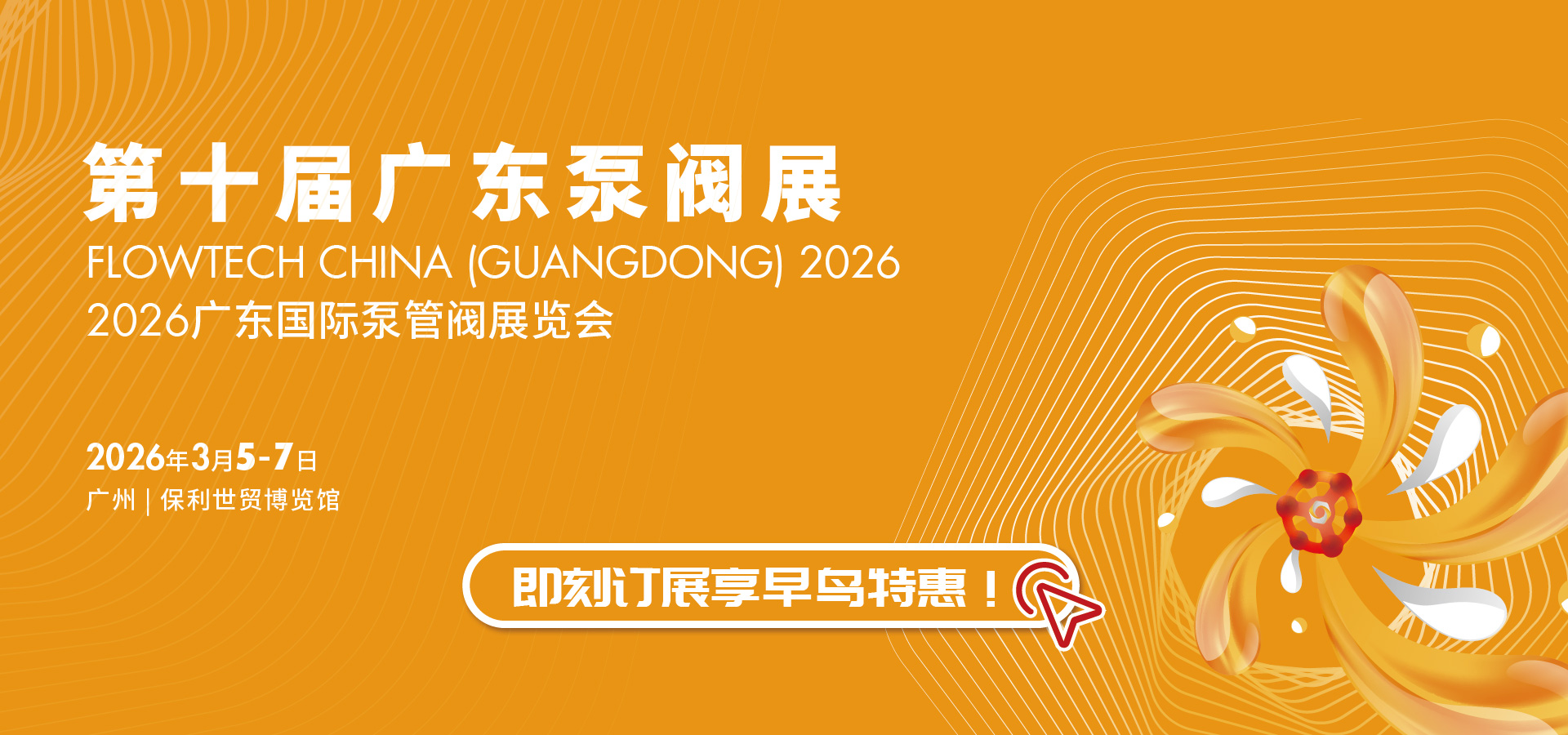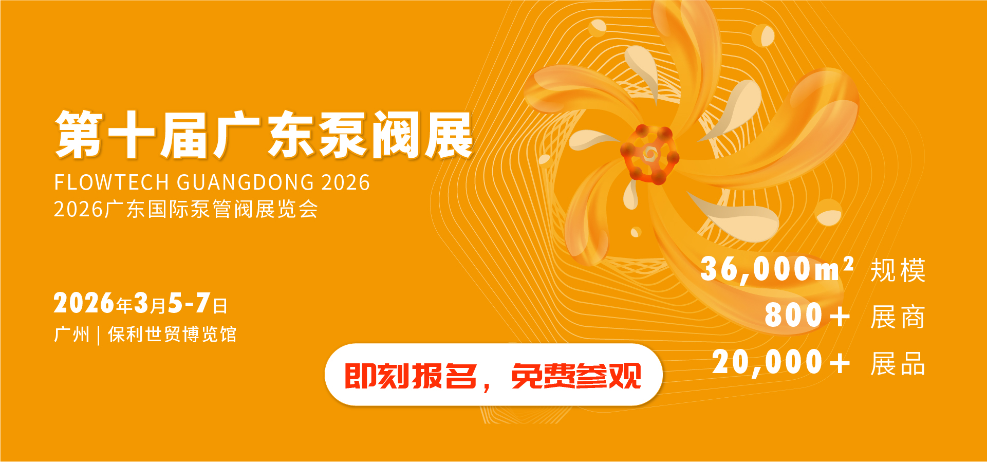 第十屆廣東泵閥展將于2026年3月5-7日在廣州丨保利世貿(mào)博覽館盛大啟幕!展覽面積達36,000平方米,預計將匯聚超20,000名專業(yè)觀眾,吸引800余家優(yōu)質展商踴躍參展。